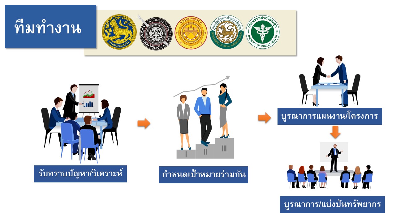 ปัจจัยหลักที่สำคัญซึ่งถือเป็นหัวใจของการทำงานก็คือ ทีมทำงานที่ประกอบด้วย "ภาคีเครือข่าย" หลายภาคส่วนที่มีส่วนร่วมที่สำคัญทั้งในระดับอำเภอและระดับตำบล